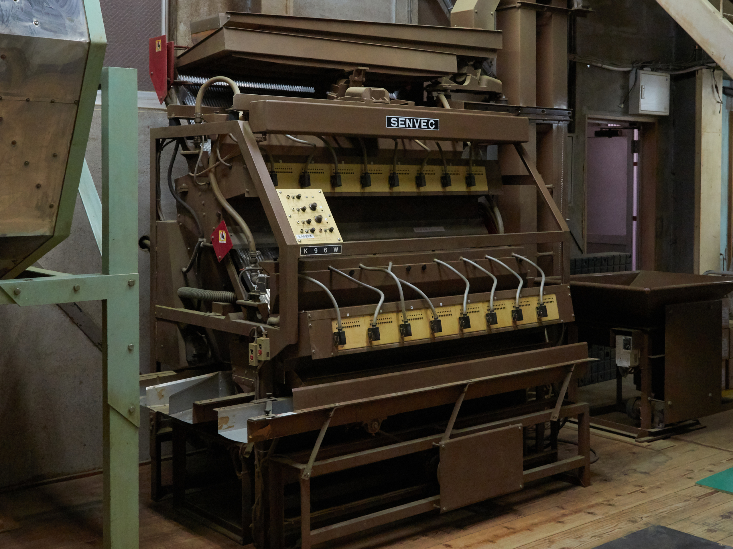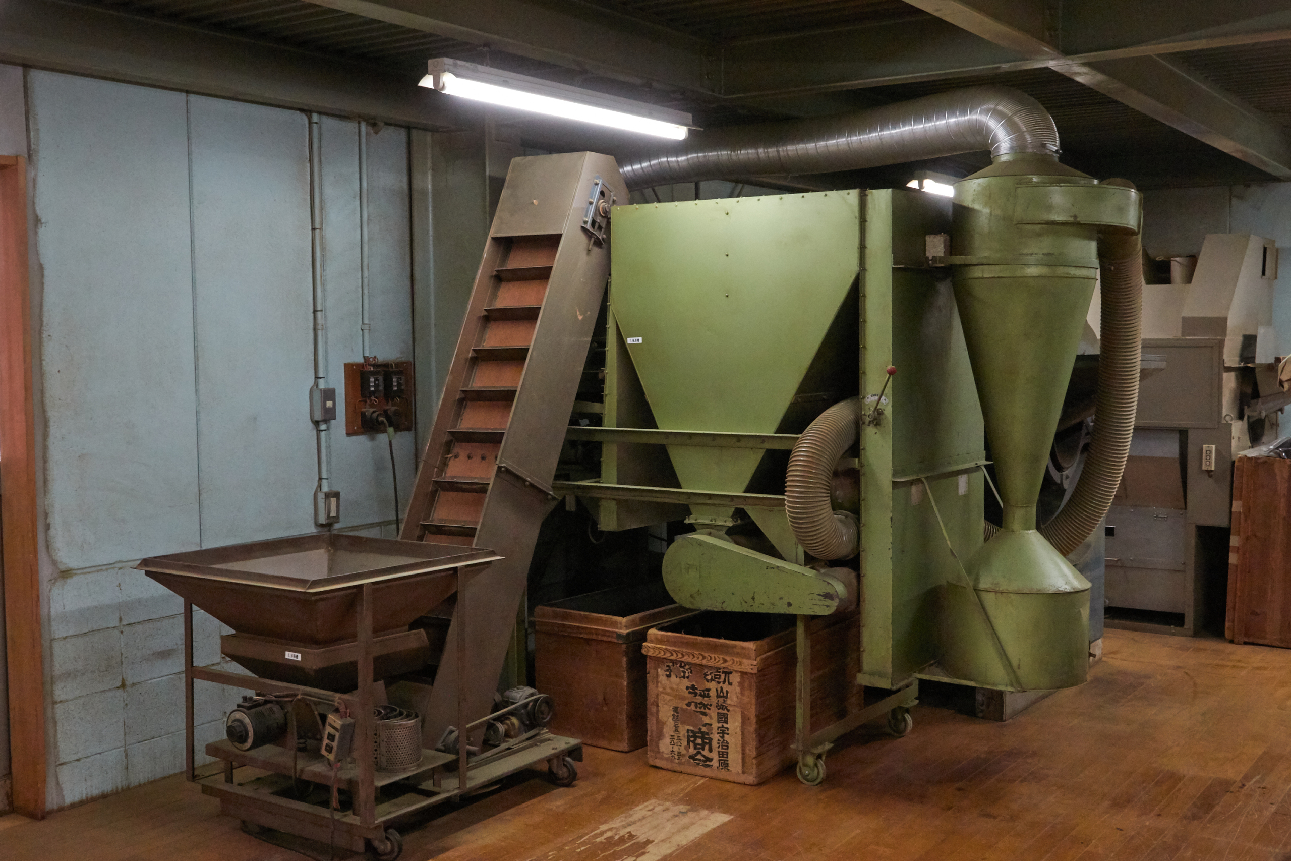 荒茶を入れて、風で茎茶やカリガネを飛ばし選別します。