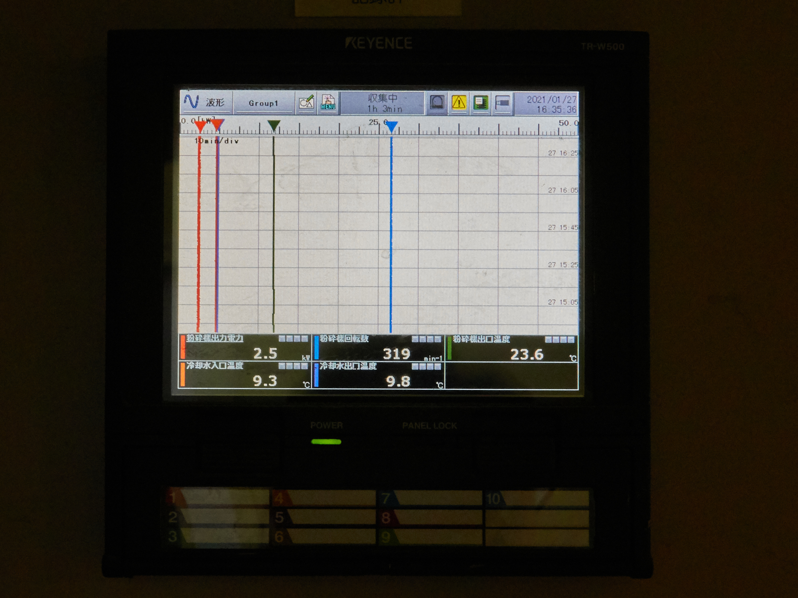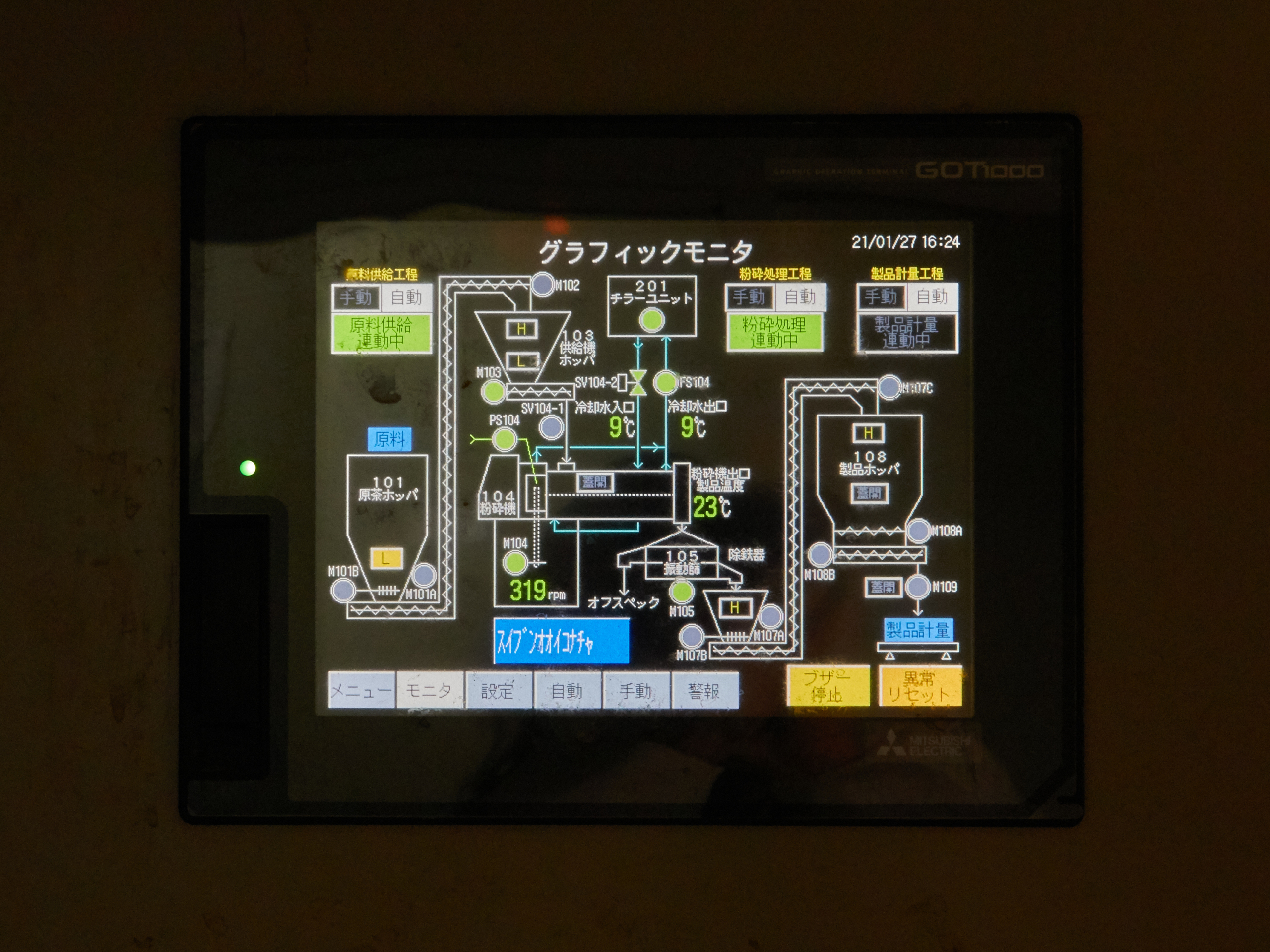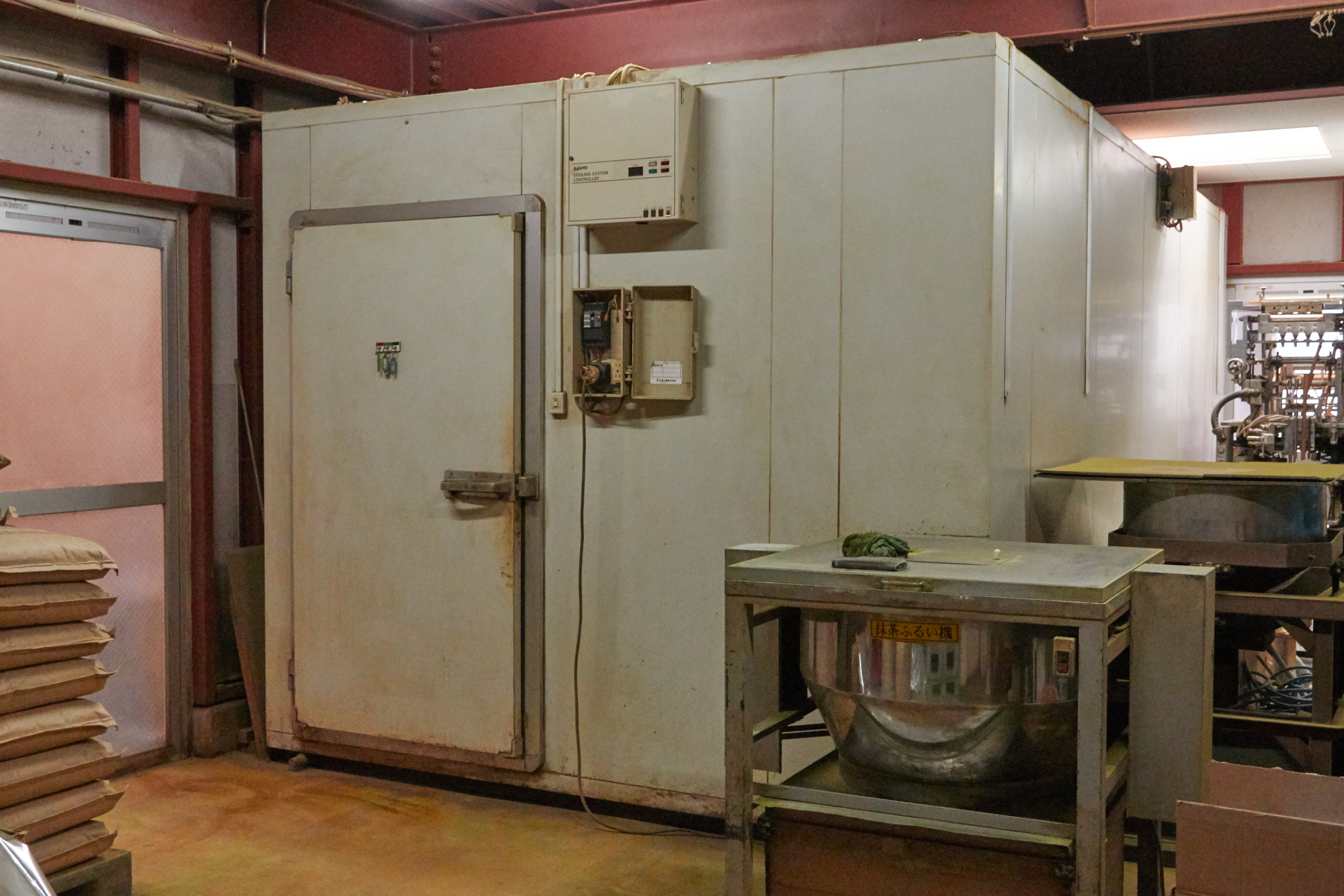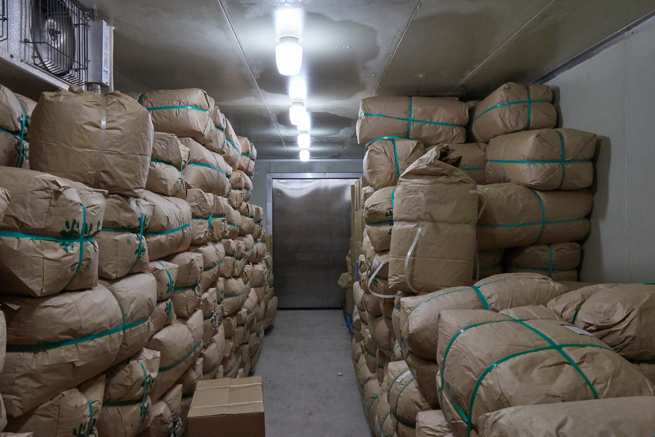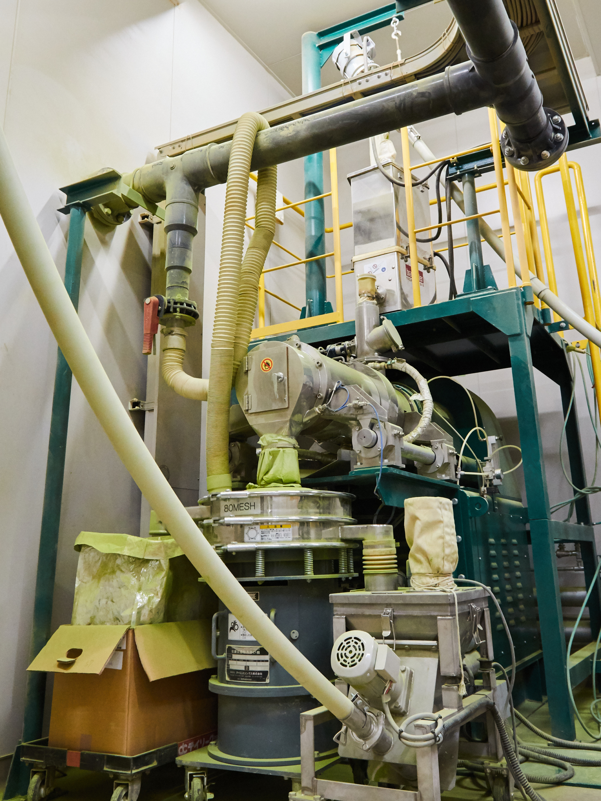 一般的には13ミクロン程度の設定ですが、藤二商会では食品加工用に非常に細かい10ミクロン程度に粉砕しています。また、粉砕中は機械が熱を持ちお茶の変色するのを防ぐため 7℃以下の冷蔵室で行っています 。